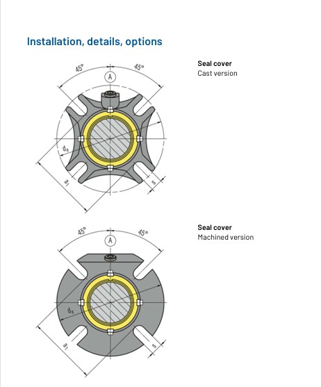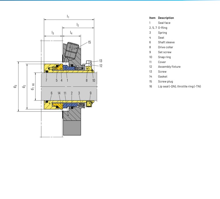 Single seals without connections (-SNO), with flush (-SN) and with quench combined with lip seal (-QN) or throttle ring (-TN)