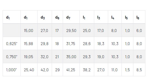 Shaft diameter: d1 = 15 mm, 5/8”, 3/4”, 1″