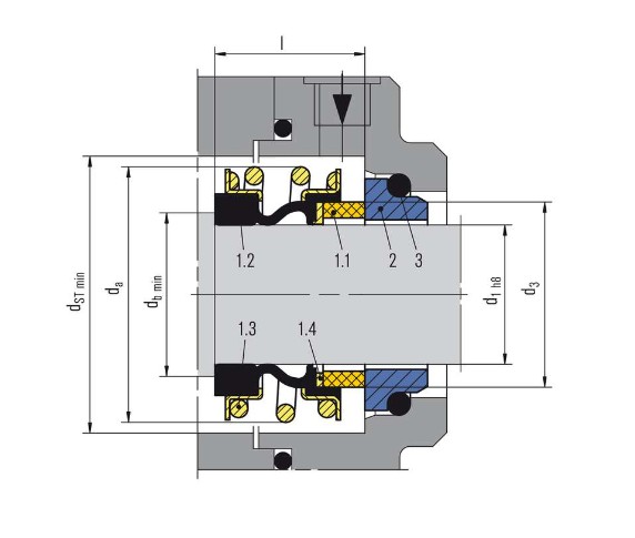 Small outer diameter of bellows support (dbmin) enables direct retaining ring support, or smaller spacer rings